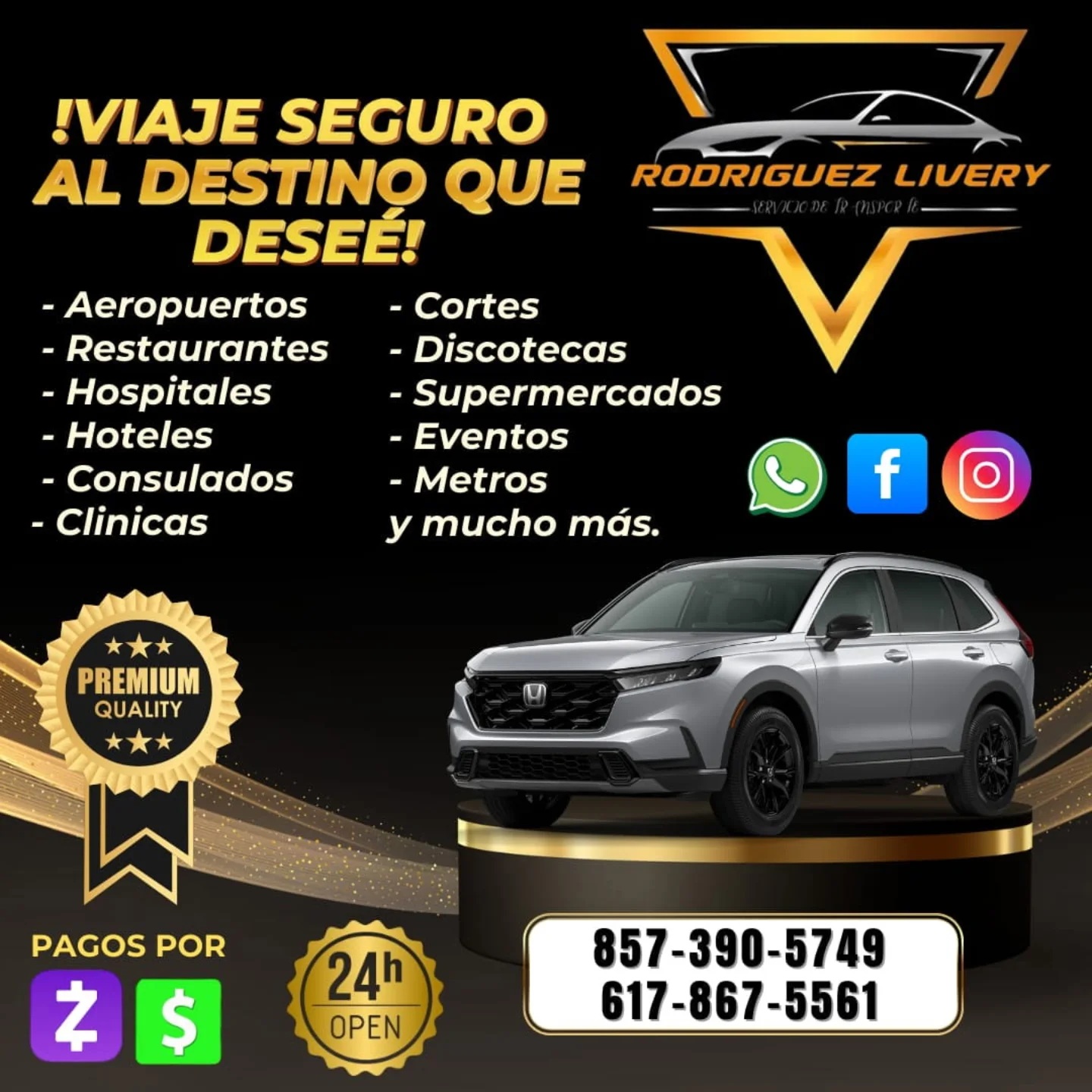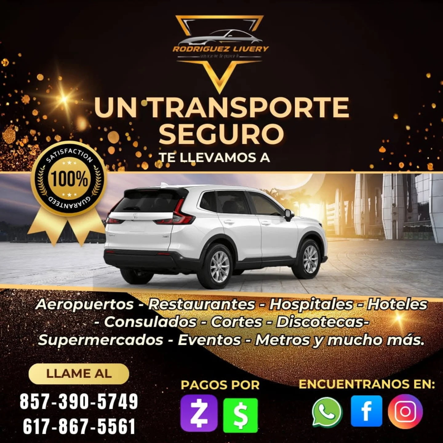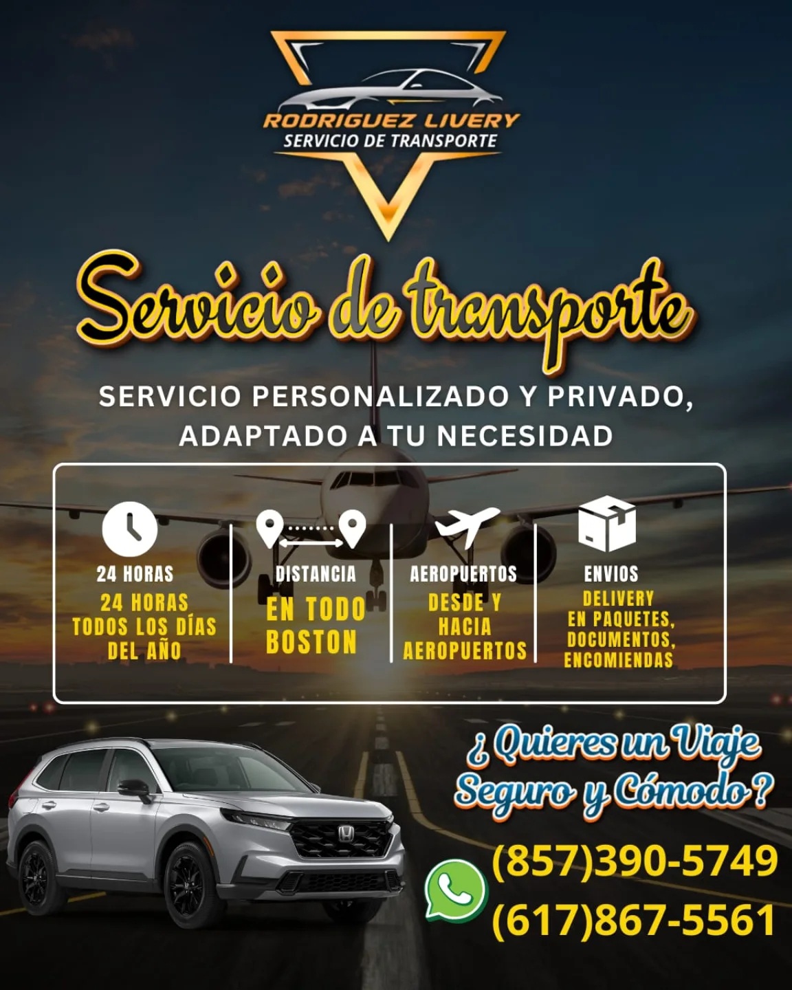 At Rodriguez Livery LLC, we offer reliable, comfortable, and safe private transportation for any occasion. We take you to work, events, the airport, restaurants, hotels, tourist centers, hospitals, courts, consulates, nightclubs, schools, churches, shopping centers, supermarkets, daycare centers, or anywhere else you need to go. We stand out for our punctuality, personalized attention, and commitment to your safety. We provide service in Chelsea, Everett, Malden, Medford, Somerville, Revere, Cambridge, Lynn, East Boston, Winthrop, and Arlington, MA. With Rodriguez Livery LLC, your destination is always in good hands.